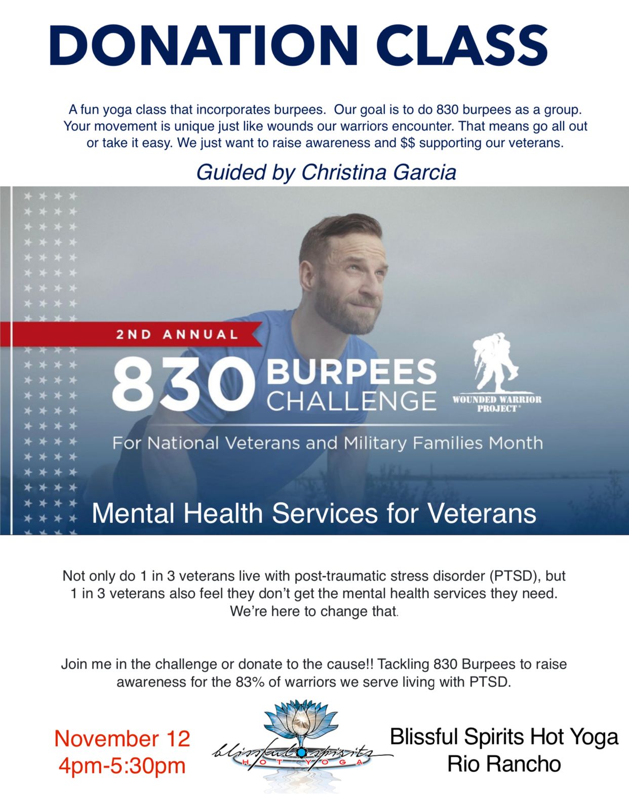 Your attendance matters. Dedictate this class to a veteran/s on you heart and mind. Come to support your friend.